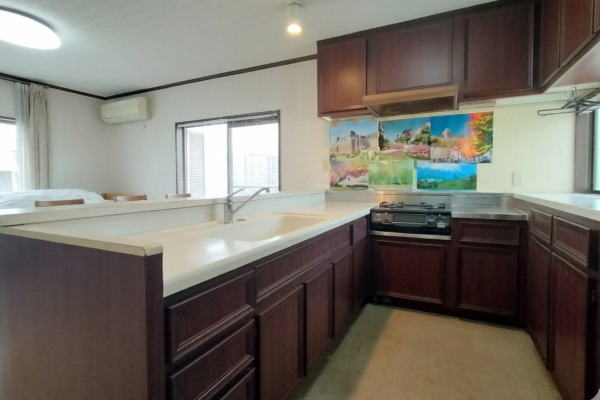 Good!!窓から差し込む光が心地よい、収納力抜群のU字型キッチンが主役の物件。三方を囲むカウンターは、広々とした作業スペースを確保。動線が短く、体の向きを変えるだけでスムーズに調理が進みます。全居室に収納を完備。荷物が多いご家庭でも、居住空間を常にすっきりと保てるのが魅力の中古戸建です。車駐車スペースは一台あります。